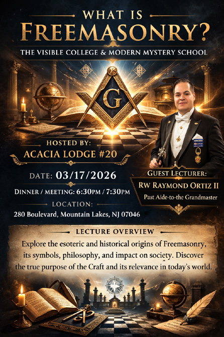 Acacia Lodge No. 20 is one of five Freemasonic Lodges that make up the 11th District of the most Ancient and Honorable Society of Free and Accepted Masons of the Grand Lodge of New Jersey. We are based in Mine Hill, NJ.