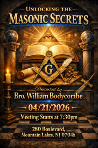 Warranted in 1851, we celebrated our 150th anniversary in 2001. Regular Communications are held on the First and Third Wednesday, with Officer’s rehearsals on the opposite Wednesday’s, except during the months of July and August when the Lodge is on Summer Refreshment. Gavel sounds at 7:30PM. Dinner at 6:30PM.